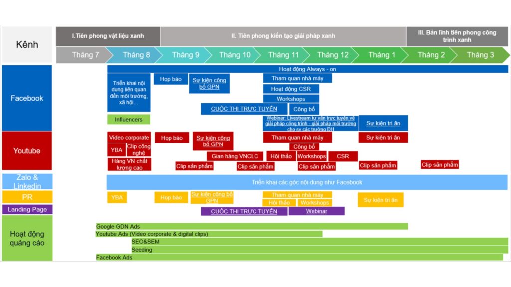 RA triển khai kế hoạch 3 giai đoạn (Trước ra mắt – Ra mắt – Duy trì) trên Facebook, YouTube, Zalo, LinkedIn và PR online. Nội dung được cấu trúc theo bốn trụ cột: thương hiệu, sản phẩm, công nghệ sản xuất và giá trị xanh. Các hoạt động bao gồm: video giới thiệu doanh nghiệp, bài viết kỹ thuật, quảng cáo đa nền tảng và hỗ trợ sự kiện nhằm tăng độ tin cậy và thúc đẩy nhu cầu tìm hiểu của nhóm khách hàng B2B.