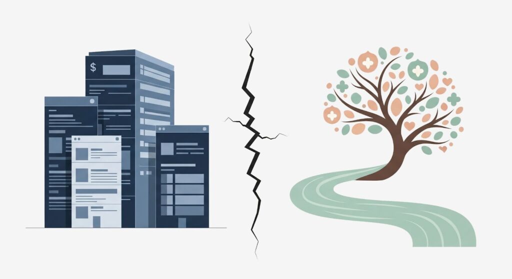 Chúng ta có xu hướng tìm kiếm những điều quen thuộc. Khi một thương hiệu có thiết kế phù hợp với kỳ vọng của ngành nghề, niềm tin sẽ ngay lập tức được củng cố. Ví dụ, Sự đối lập trong thiết kế giữa hai ngành Tài chính và Chăm sóc sức khỏe thể hiện rõ ràng “ngôn ngữ thị giác” khác nhau. Đối với ngành tài chính (bên trái), thiết kế website với các khối hình học vững chắc, màu xanh đậm và xám, cùng cấu trúc bố cục rõ ràng, nhằm tạo dựng cảm giác an toàn, ổn định và đáng tin cậy. Ngược lại, ngành chăm sóc sức khỏe (bên phải) sử dụng các đường nét mềm mại, tông màu tự nhiên và ấm áp để gợi lên sự an lành, tin cậy và sự quan tâm. Khi một thương hiệu đi chệch khỏi quy tắc này, như hình ảnh vết nứt ở giữa, sẽ gây ra sự nghi ngờ và làm suy giảm niềm tin của người dùng.
