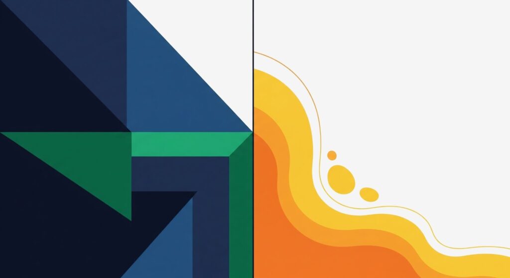 Hai thiết kế đối lập, một bên dùng đường nét góc cạnh, màu xanh đậm để thể hiện sự quyền uy và ổn định, bên còn lại sử dụng đường cong mềm mại, tông màu ấm để gợi sự thân thiện, gần gũi.
